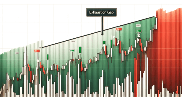 Tükeniş fiyat boşlukları, mevcut yükseliş trendinin zirvesine yaklaşıldığını işaret eden boşluklardır. Varlığın hızlı yükselişin ardından soluklanması ve yatırımcıların kâr realizasyonu yapmasıyla ortaya çıkar. Güçlü bir yükselişin ardından oluştuğu için tükeniş olarak adlandırılır.
